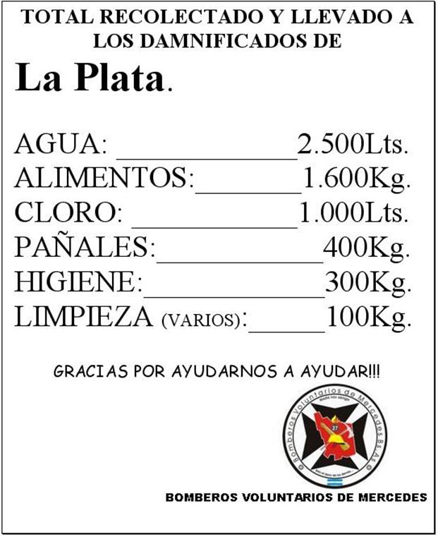Bomberos Mercedes fue una de las diversas instituciones que donaron bienes que los mercedinos acercaron a su institución para los inundados de La Plata. Pasados ya algunos días dieron a conocer cifras de la solidaridad.