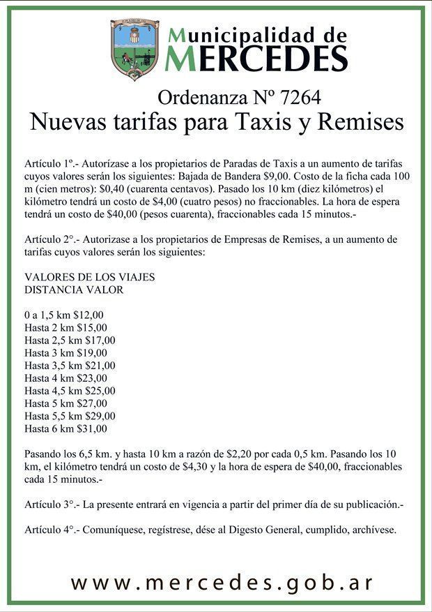 El nuevo tarifario que los mercedinos deberán tener presentes a la hora de tomar un vehículo es el siguiente: