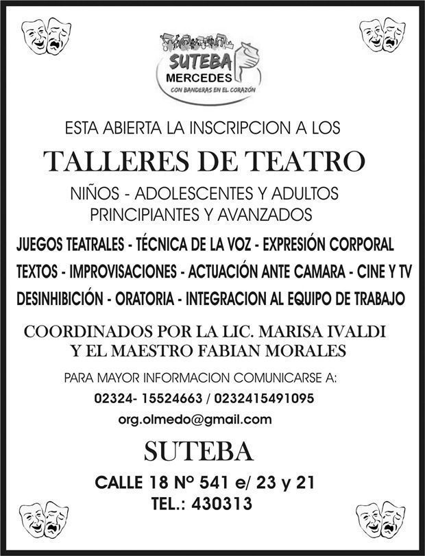 Suteba Mercedes invita a participar de una serie de talleres de teatro para niños, adolescentes y adultos, tanto para aquellos que tienen ya experiencia en el tema como quienes recién se inician.