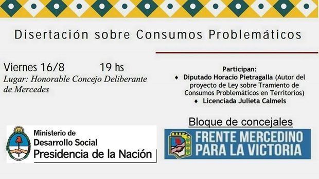 Este viernes por la tarde se desarrollará en el recinto del Concejo Deliberante una disertación sobre «Consumos problemáticos» a cargo del Diputado por el Frente para la Victoria Horario Pietragalla y Julieta Calmels. Se invita a la comunidad a ser parte del encuentro con centro en problemáticas sociales siempre necesarias de atender.