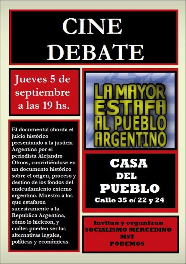 Para terminar, invitamos a toda la ciudad de Mercedes para debatir este tema al CINE DEBATE que realizaremos este jueves 5 de septiembre a las 19hs en la Casa del Pueblo (35 e/ 22 y 24) donde proyectaremos la película “La Mayor estafa al Pueblo Argentino”, un documental que nos invita a recorrer la relación histórica de la Argentina con sus acreedores internacionales, su origen y la aplicación de dicho endeudamiento. El documental también aborda el juicio histórico presentando a la justicia Argentina por el periodista Alejandro Olmos, convirtiéndose en un documento histórico sobre el origen, proceso y destino de los fondos del endeudamiento externo argentino. También muestra a los que estafaron sucesivamente a la Republica Argentina, cómo lo hicieron, y cuáles pueden ser las alternativas legales, políticas y económicas, para terminar con un flagelo que azota a la Argentina.