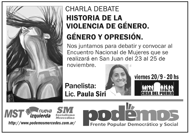 En el Marco de la convocatoria al Encuentro Nacional del Mujeres a realizarse en la Provincia de San Juan los días 23,24 y 25 de noviembre de este año, desde el MST y el Socialismo Mercedino se invita a toda la comunidad a reunirnos y debatir sobre la cuestión de género en un marco histórico-político llevado adelante por la Lic. en Psicología Paula Siri, candidata a Concejal por el Frente PODEMOS.