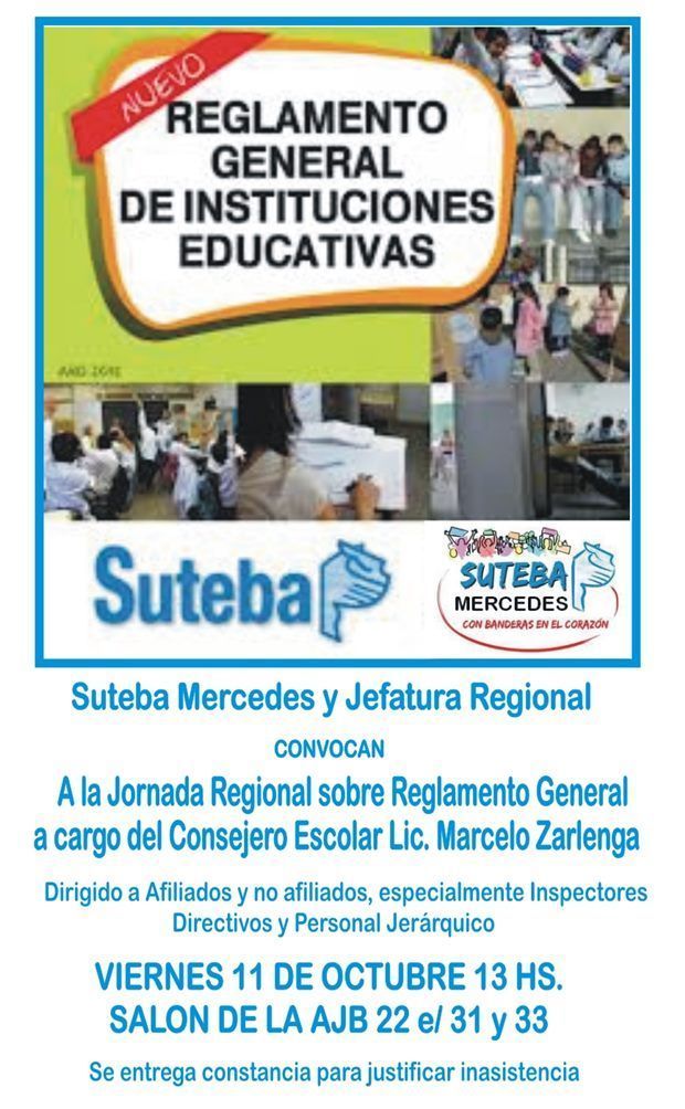 SUTEBA Mercedes invita a la Jornada Regional sobre Reglamento General que se realizará el día viernes 11 de octubre, a cargo de nuestro Consejero Gral. Marcelo Zarlenga, en convocatoria conjunta con Jefatura Regional.