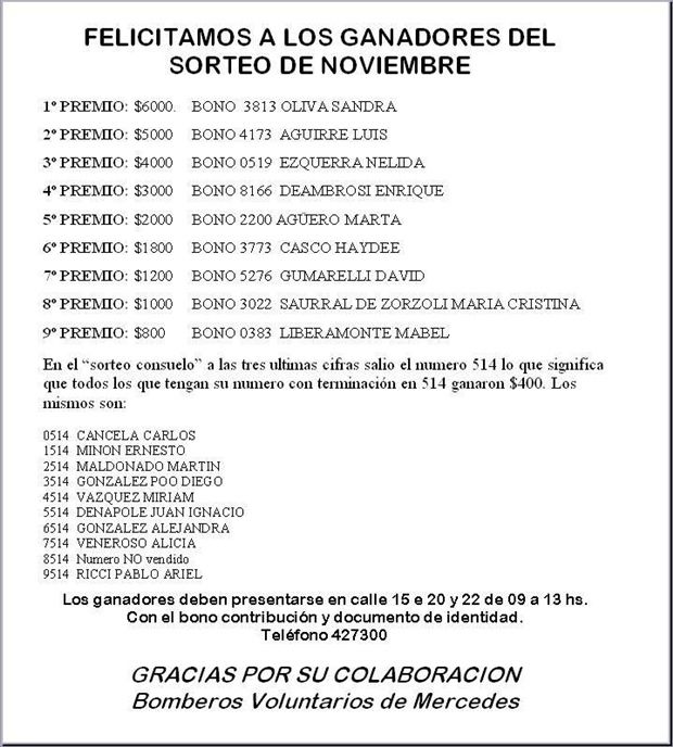 Bomberos Mercedes llevó a cabo un nuevo sorteo de la tradicional rifa de los bomberos de nuestra ciudad. La institución dio a conocer los ganadores de noviembre en diferentes premios. Es importante recordar que ésta acción sirve de apoyo a la institución que voluntariamente brinda un servicio fundamental para la vida de los mercedinos.