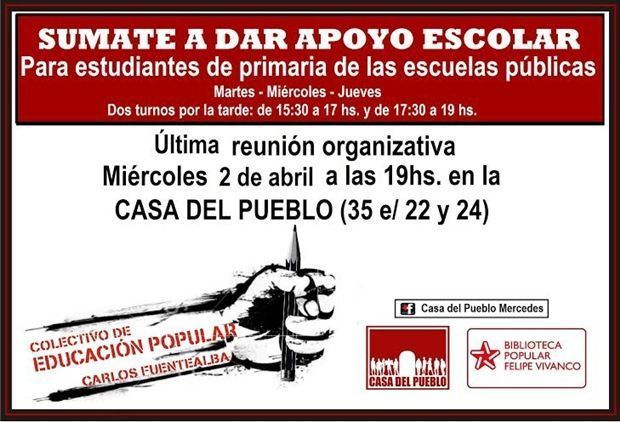 Desde el Colectivo de Educación Popular Carlos Fuentealba, informamos que ya hemos avanzado en la organización de los diferentes días y horarios en que funcionará el apoyo escolar en la Casa del Pueblo.