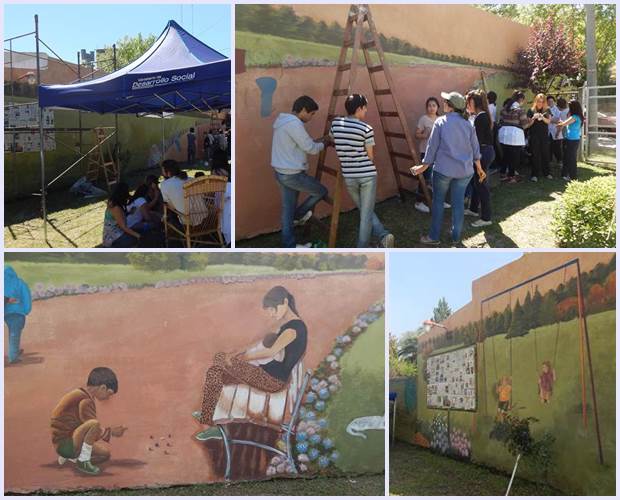 Las actividades organizadas por el equipo del Centro de Referencia integrado por: Natalia Barsotti, Federico Moyano, Rosana Révora y Silvio Paredes; comenzaron el 1 de octubre en el Hogar Ulises D`Andrea y tuvieron como eje el intercambio intergeneracional y la inclusión. El director de la Escuela de Arte, Carlos Zunino contó que “la pintura de este mural es el cierre de la jornada realizada por equipo del Ministerio en el marco de la promoción de los buenos tratos en adultos mayores. Se nos invitó a participar y a través de las charlas con los abuelos del hogar surgió este diseño que hace referencia a sus juegos de niños”. El mural se realizó entre el martes 21 y el viernes 24 y tiene cerca de 24 metros.