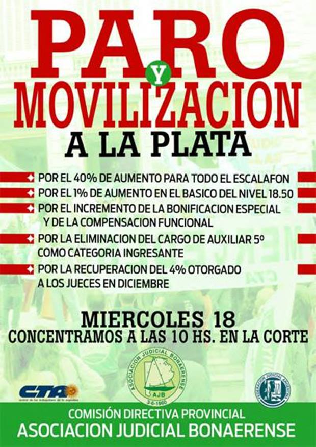 Ante esta situación y tal lo que se desprende de los mandatos asamblearios, se convoca a paro y movilización para el próximo miércoles 18 de marzo. La concentración se realizará en horas de la mañana en el edificio de la Suprema Corte de Justicia en La Plata.