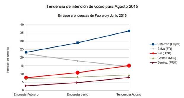 Según la consultora privada Blanco CP, quien realizo la segunda medición de intención de votos de los candidatos a Intendente de la ciudad, la primera había sido en el mes de febrero en donde arrojaba los siguientes resultados con el 23,2% lidera la lista Juan Ignacio Ustarroz (FPV), en segundo lugar se ubica con un 22,3% Carlos Selva (FR), el tercer lugar queda para Lucas Fal (UCR)con un total de 7,7%. La cuarta ubicación es para Castelucci (A.J) con el 7,2%, en quinto lugar está José Cestari (MIC) con un 7%.