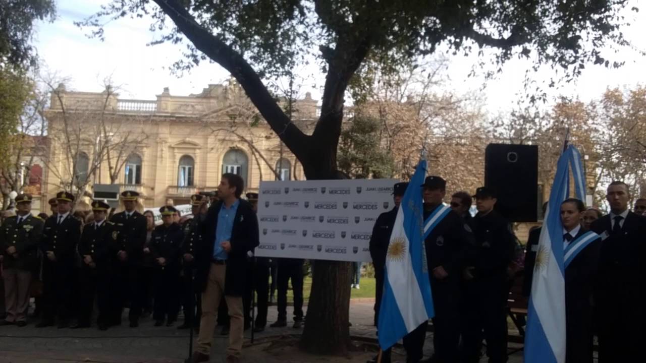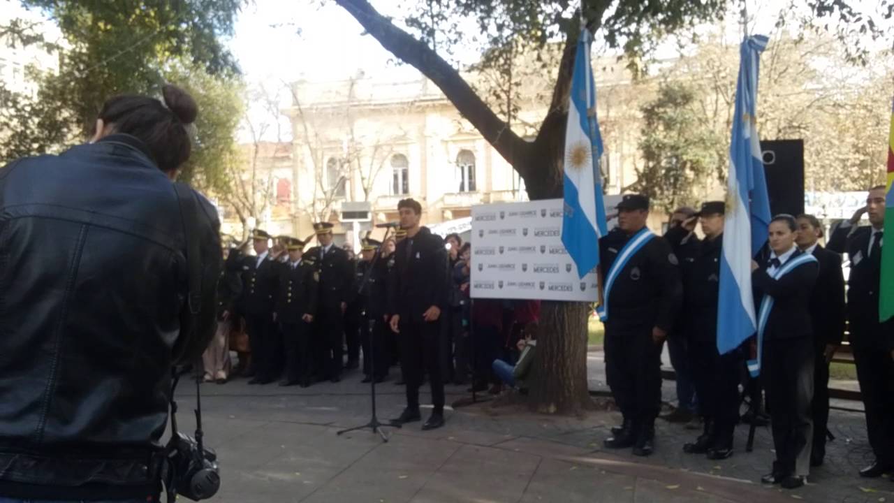 Luego del momento vivido en el Concejo se procedió al acto formal en Plaza San Martín donde las estrofas del himno nacional fueron entonadas por Marcelo Benjamín Aguirre.
