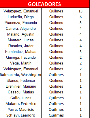 | Quilmes | 5 | Emanuel Velázquez (3), Facundo Piacenza, Rosales |