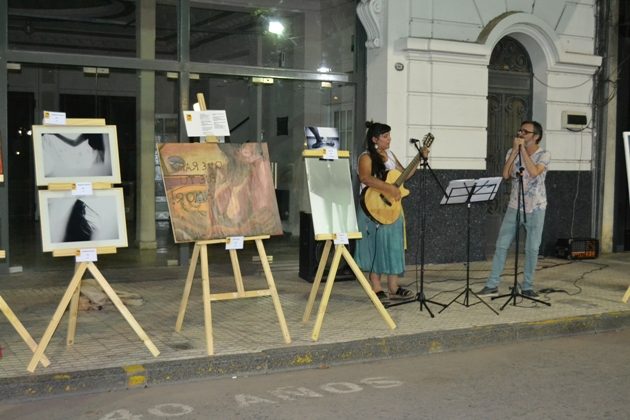 Al aire libre, durante las últimas horas del día sábado, cuando la noche se presentaba en la ciudad y hasta pasada la medianoche, en círculo se mostraron los trabajos intercalando las pinturas de los artistas plásticos con las imágenes de los fotógrafos convocados y algunos textos de Carmen Gioscio y Oscar Dinova con la música de Marilina Erramuspe y Tato Deluca.