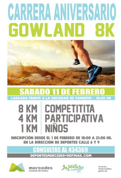 Por el festejo del 129º Aniversario de la Localidad de Gowland se correrá la Maratón 8k. La competencia tendrá tres variantes, una competitiva de 8 Km., una de participación de 4 Km. y una de niños de 1 Km.
