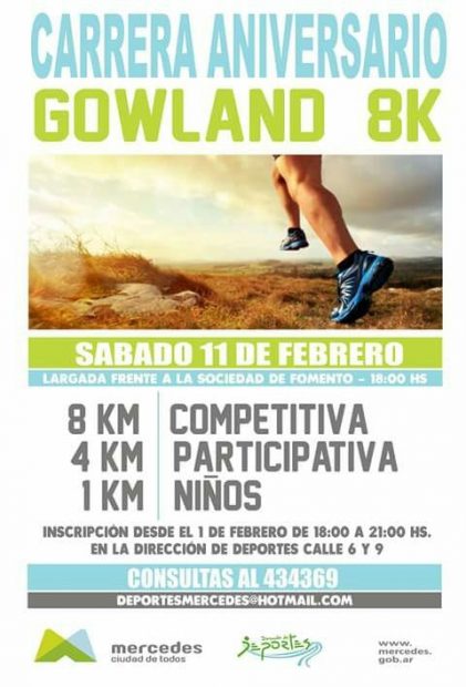 En el marco de los festejos por los 129 años de la localidad de Gowland, este sábado se realizará un festejo deportivo con una carrera de 8 kilómetros y otras de 4 y de 1 kilómetro para los niños. Desde la hora 18, la maratón partirá desde la Sociedad de Fomento de Gowland – Agote.