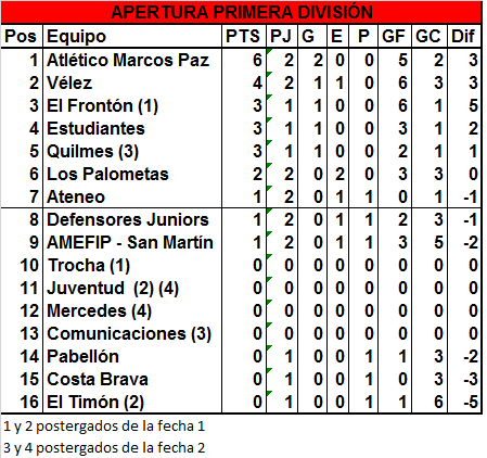 Atlético Marcos Paz 1: Pablo López, Cristian Pereira, Nahuel Fernández, Ignacio Ruiz, Mariano Broggi, Darío Broggi, Federico Amorena, Mauro Cristaldo, Nazareno Eguía, Diego Correa y Juan Avalos. DT: Aquino. Suplente: Marcos Sierocki.