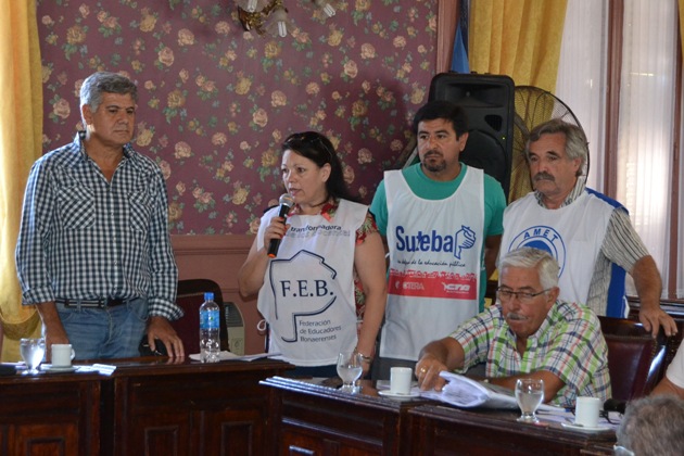 Fuera de reglamento, los Concejales autorizaron la palabra de los docentes reunidos en los gremios. Antes de terminar la sesión, las representantes gremiales Silvia Gandolfi (UEB Mercedes), Fabián Díaz (SUTEBA), Eduardo Rando (AMET) y Luis Herrera (UDOCBA) dieron cuenta de lo que vivieron en los últimos días en las escuelas mercedinas.
