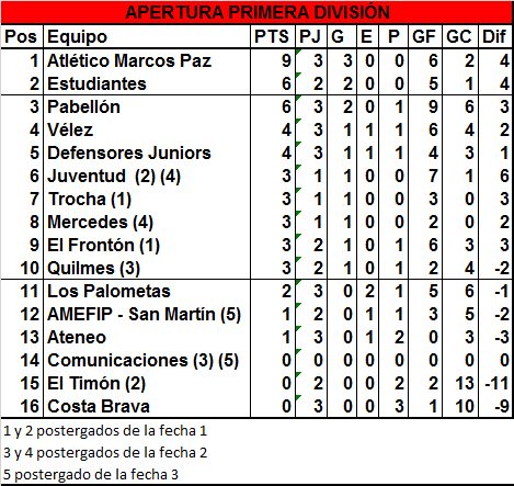 Culminó la tercera fecha del torneo Apertura de Primera División de la Liga Mercedina con los cuatro partidos que se jugaron este domingo. En Suipacha, Juventud goleó en su primer partido en el torneo por 7 a 1 a El Timón, que venía de perder 6 a 1 ante El Frontón. Además, Trocha, sin demasiado esfuerzo, goleó 3 a 0 a un juvenil Quilmes que difiere en forma total del equipo que salió campeón. Además, Estudiantes volvió a ganar y sigue prendido, mientras que Defensores Juniors derrotó a Ateneo por 2 a 0.