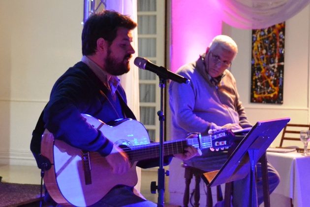 Anticipando cada fragmento de los tres cuentos largos (o novelas cortas), Juan Habermann le puso música en vivo con su guitarra. Así enmarcó la primera historia con “Mi Niñez” de Joan Manuel Serrat, “Bienvenidos al Tren” de Sui Generis y el tango “Hasta el último tren”.