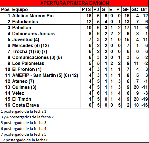 Luego fue el turno del único líder del torneo, Atlético Marcos Paz, que sigue con puntaje ideal al ganar su sexto partido consecutivo. En esta oportunidad fue goleando a Costa Brava, que sigue haciendo de local en cancha de la Liga Mercedina y que es el otro equipo que sigue sin ganar y, particularmente, el único que no sumó, además de promediar más de 3 goles en contra por partido. Respecto a la visita, todavía no quedó libre, por lo que en las próximas fechas podría ser alcanzado por equipos como Mercedes y Trocha, los dos que deben más de un partido y que en lo poco que jugaron, no perdieron ni un punto.