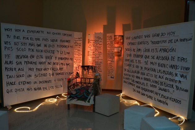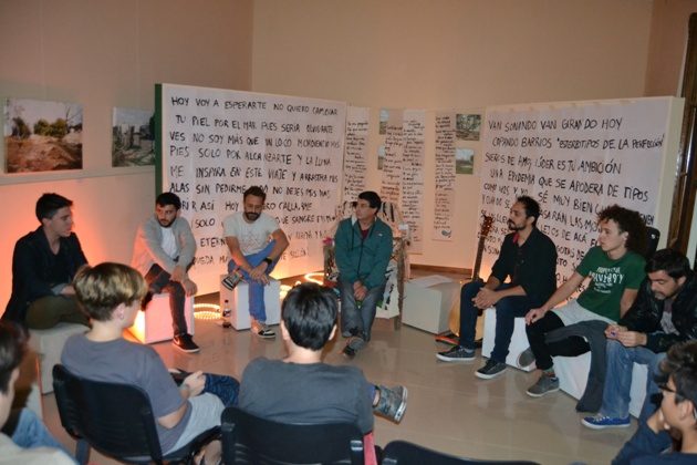 Delante de la instalación realizada por Luciana Aguiar con letras de los compositores de Mercedes, los músicos invitados respondieron las preguntas del periodista y se animaron a tocar en vivo solamente acompañados por una guitarra.