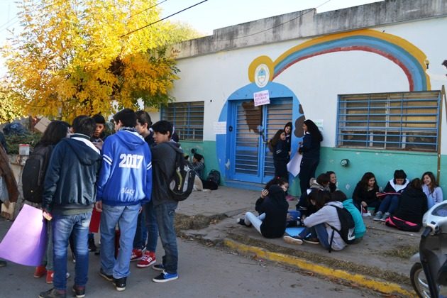 Los alumnos de la Escuela Secundaira Nº 13, que fueron trasladados al ex edificio de la Escuela Laboral por peligro de derrumbe en los techos del edificio del CENs, donde funcionan desde hace algunos años, realizaron una sentada en la puerta del edificio de calle 32 para pedir el acondicionamiento de este edificio para retomar las clases.
