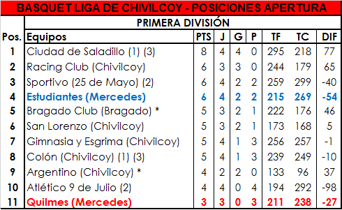 Por su parte, Estudiantes el viernes jugó el partido que tenía pendiente como visitante de Racing de Chivilcoy y tras un primer tiempo equilibrado y parejo (29-29), el equipo dueño de casa fue una aplanadora en el complemento, liderado por los juveniles Matías Morera y Santiago Barrales, y finalmente se quedó con la victoria por 81-55 para mantener el invicto.