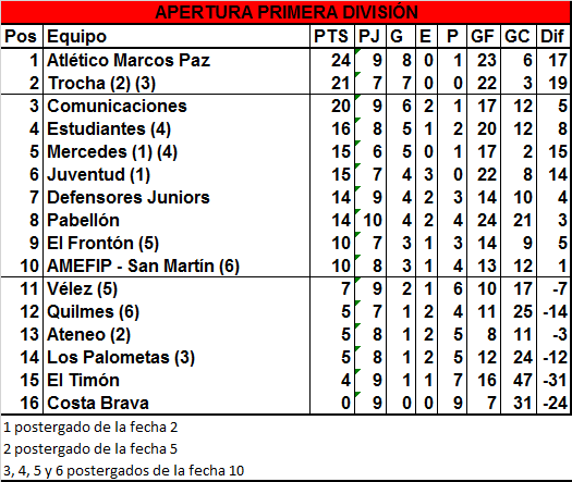 Solo tres partidos se jugaron de la fecha diez de Primera División de la Liga Mercedina y esa trilogía ocurrió fuera de Mercedes, ya que los encuentros programados del sábado se tuvieron que postergar dado que la lluvia dejó imposible el campo de juego. En esos enfrentamientos, Comunicaciones dio la sorpresa al quitarle el invicto a Atlético Marcos Paz, equipo que por el momento sigue liderando el campeonato, pero ahora puede ser alcanzado por Trocha si es que gana su encuentro que jugará en la semana.