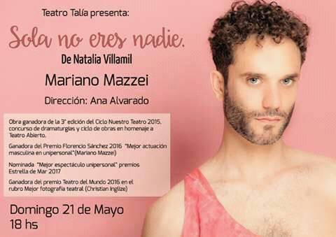 Una nueva obra se presentará en el Teatro Talía de Mercedes. Nuevamente un elenco invitado subirá al escenario de la sala de calle 20 entre 29 y 31. En esta oportunidad, el obra se titula «Sola no eres nadie», cuya dramaturgia es de Natalia Villamil. La función está prevista para el domingo 21 de mayo, 18 horas.