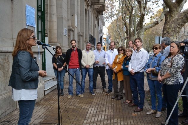 Se descubrió la placa que evoca el momento ocurrido en horas del mediodía del miércoles. Margot, Ustarroz, Dematei y Nicolás Lennard fueron los responsables de descubrirla. En la placa se identifica y reconoce el valor arquitectónico, histórico, y cultural de la Biblioteca Sarmiento.