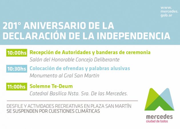 El próximo 9 de julio se conmemorará un nuevo aniversario de la independencia. Será el 201 y se efectuarán en nuestra ciudad los tradicionales actos y encuentros protocolares mientras que el desfile que estaba programado debió ser suspendido por el clima y la mala proyección del pronóstico para los próximos días