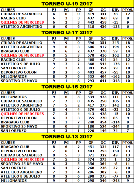 Buenas diferencias finales y victorias en U15 y U17. En U15, ante un rival que dependía básicamente del potente goleo de Lejarza (27 ptos) y la conducción de Mambelli, se le opuso un gran juego de equipo con un buen nivel de Graziadei en la conducción (con el agregado de 10 ptos.), la regularidad de Tassara, el goleo de Beyer y F. Contardi y el “overol” de B. Brilado ante el gigante Lejarza contribuyeron a la buena victoria quilmeña.