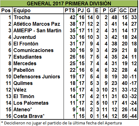 Vélez y Palometas empataron cero a cero en un flojo partido, donde ninguno de los dos pudo aprovechar la victoria que tuvieron en el debut. En el debut de la jornada, AMEFIP San Martín venció 2 a 0 a un Defensores que inició el Clausura con toda la ilusión y por ahora sigue sin sumar. Para los de Camargo y Rementería, este triunfo significa la continuidad del buen trabajo que vienen realizando, buscando seguir achicando puntos a Trocha en la General.