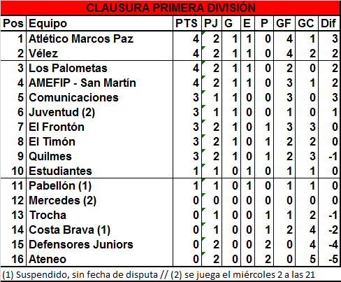 Vélez y Palometas empataron cero a cero en un flojo partido, donde ninguno de los dos pudo aprovechar la victoria que tuvieron en el debut. En el debut de la jornada, AMEFIP San Martín venció 2 a 0 a un Defensores que inició el Clausura con toda la ilusión y por ahora sigue sin sumar. Para los de Camargo y Rementería, este triunfo significa la continuidad del buen trabajo que vienen realizando, buscando seguir achicando puntos a Trocha en la General.