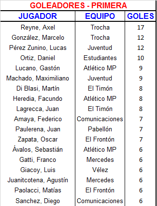 | Estudiantes | 5 | Damián Mansilla (3), Gustavo Serio y Juan Gatti |