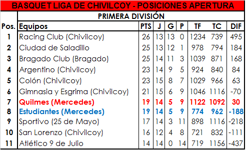 QUILMES 70: Mc Cormack 19, Zumpano 17, Boanfina 13, Perdomo 5, S. Cejas 4, Cosentino 4, R. Colicigno 3, P. Moner 3, Manganiello 2, A. Vallejos. DT: J. L. Giallorenzo