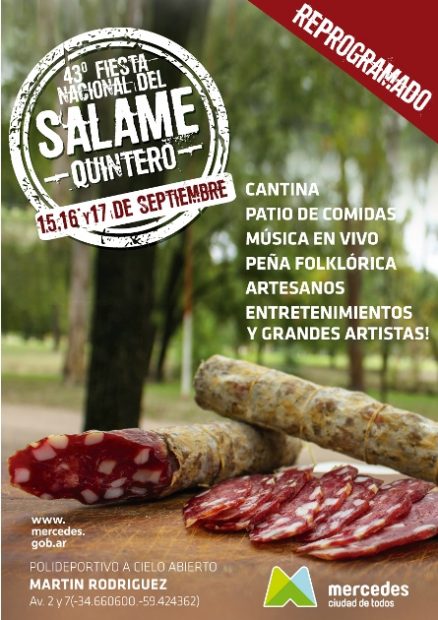 Dado el desfavorable pronóstico del tiempo constatado en distintas fuentes y el pedido de los productores locales se tomó la decisión de pasar la gran Fiesta del Salame Quintero para los días 15, 16 y 17 de septiembre, siempre con la excelente propuesta gastronómica, musical y de entretenimiento para toda la familia.