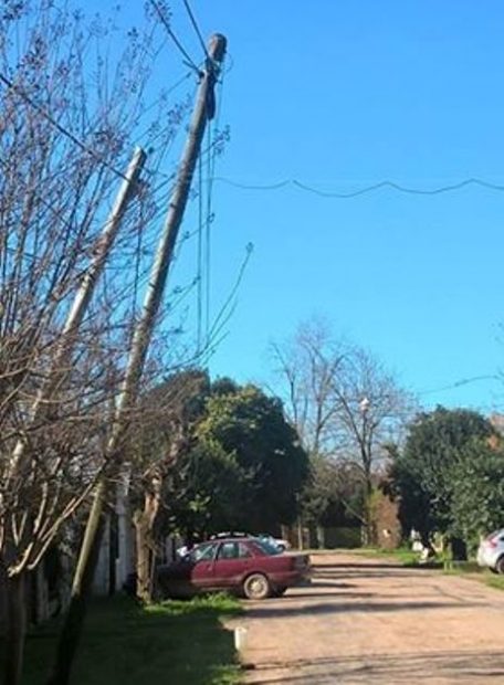 «Sobre Avda. San Martín, el poste que está torcido, está así por una tormenta del verano, el resto fue por tormentas posteriores. Estmos sin solución hasta la fecha y el peligro que estos postes en este estado conllevan hacia quienes transitan por el lugar. Los vecinos estamos cansados de reclamar a la empresa de energía eléctrica que nunca corrigió el problema. Por eso decidimos hacerlo público», cuenta una de las vecinas del barrio, Raquel Sarangello.
