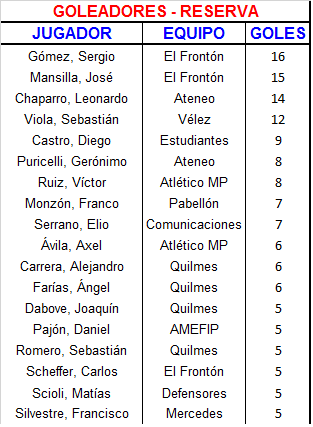 | Atl. MP | 3 | Tomás Gallo, Alexis Rocha y Víctor Ruiz |