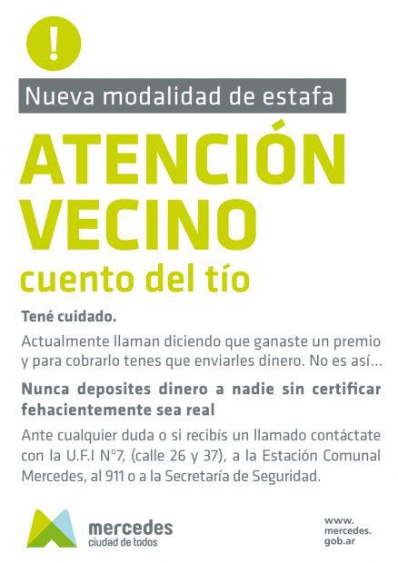 Es por ello que se insta a la comunidad en general a abstenerse de realizar cualquier tipo de transacción con personas o entidades desconocidas, como así también denunciar en caso de recibir llamadas o mensajes de texto referidos a premiaciones para las que pidan dinero.