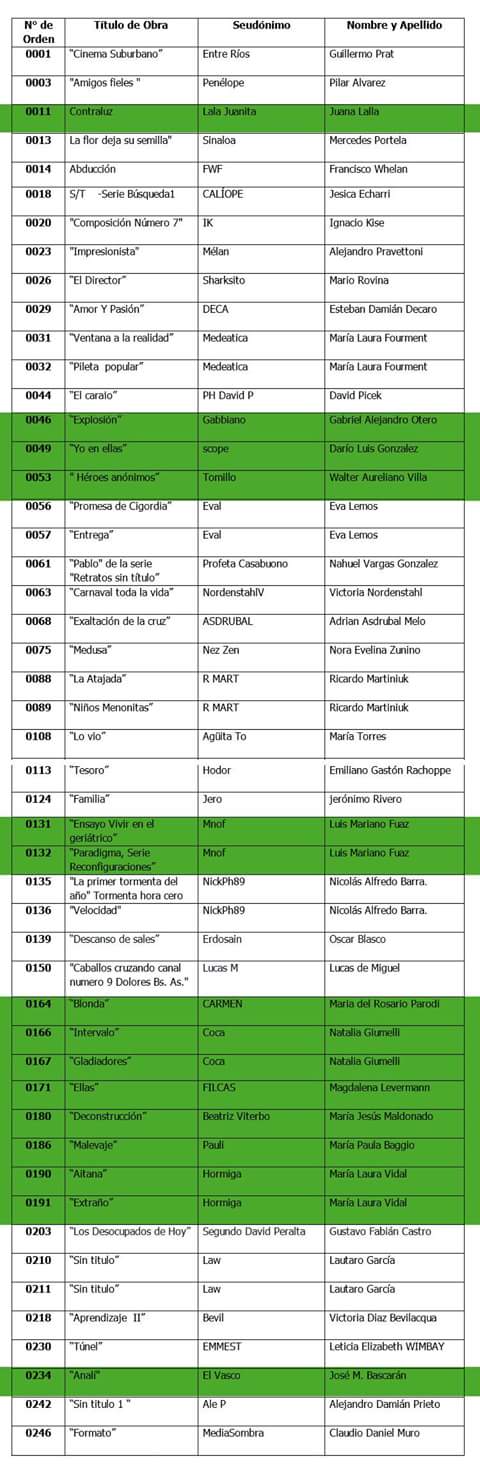 Los seleccionados de Mercedes son Juana Lalla, Gabriel Otero, Darío González, Walter Villa, Mariano Fuaz, Rosario Parodi, Natalia Giumelli, María Jesús Maldonado, Magdalena Levermann, y María Paula Baggio. A ellos se le suman, María Laura Vidal y José Bascarán de Suipacha que pertenecen a las agrupaciones de fotografía de Mercedes.