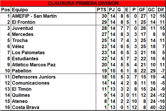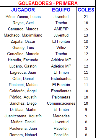 Goles en el ST: A los 7’ Germán Lucero, 10’ Marcelo Torre, 40’ Mauro Sigona y 45’ Marcos Camargo para AMEFIP-San Martín.