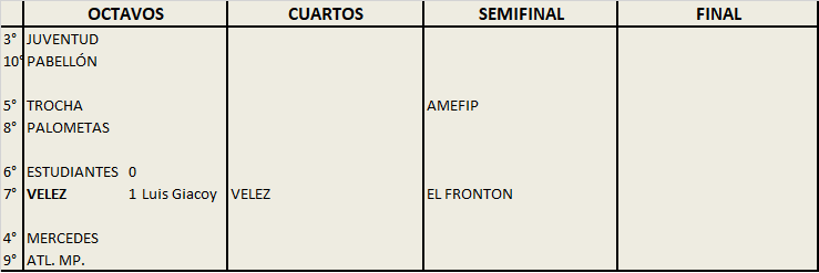 Comenzó a jugarse la Liguilla del torneo de Primera División de la Liga Mercedina de fútbol y en el primero de los cuatro partidos que se disputarán por esta etapa, Vélez derrotó a Estudiantes por 1 a 0, vengándose de la victoria del pincha el fin de semana pasado por 3 a 1 en la última fecha de la etapa regular. El único gol del partido lo hizo Luis Giacoy de penal cuando recién comenzaba el segundo tiempo.