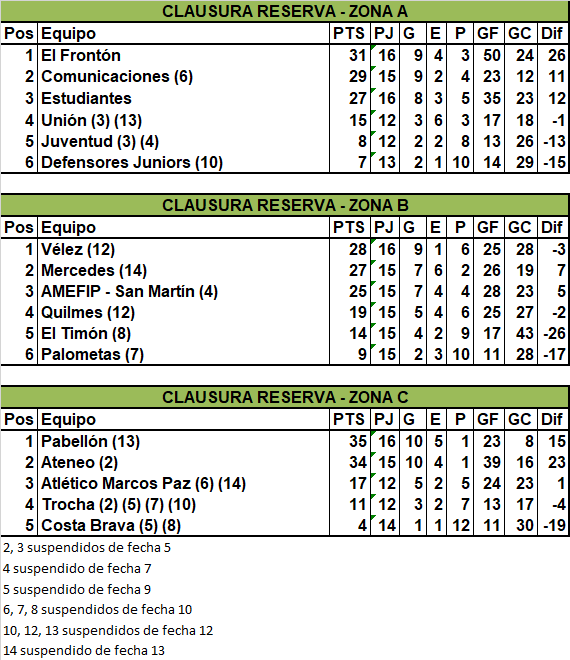 En tanto, la victoria de Comunicaciones sobre El Frontón obliga al cartero a jugar su pendiente ante Atlético Marcos Paz. También Mercedes, tras el triunfo ante El Timón, debe completar su partido pendiente ante Atlético Marcos Paz. La sucesión de partidos suspendidos obligó a los dirigentes a tomar determinaciones de optar por jugar solo encuentros que tenían importancia.