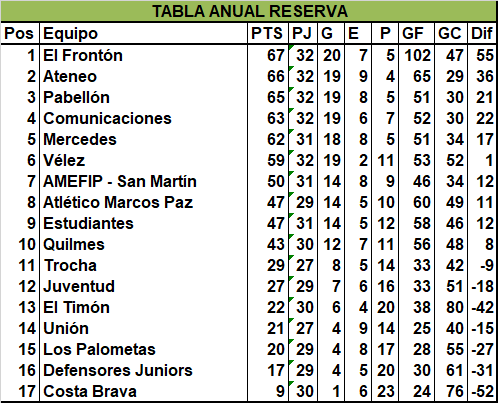 Para los amantes de las estadísticas, así quedó la tabla general del torneo de Reserva, sumando Apertura y Clausura de todas las zonas.