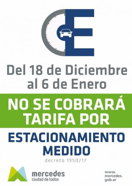 En horas de la mañana se confirmó que la Municipalidad de Mercedes no cobrará la tarifa del estacionamiento medido desde el 18 de diciembre hasta el 6 de enero en las calles incluída en la medida