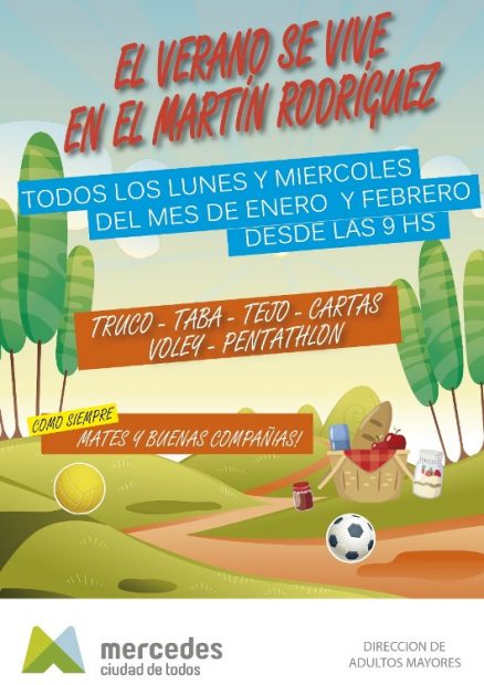 Desde la Dirección de Adultos Mayores de la Municipalidad de Mercedes llevarán adelante en el mes de enero y febrero, distintas actividades de verano para los adultos mayores de la ciudad. “Nos encontraremos dos días a la semana durante los meses de enero y febrero”, comentó Victoria Odell. Se trata de los lunes y miércoles desde las 9 horas, en el Predio a Cielo Abierto Martín Rodríguez, con mate compartiendo taba, truco, tejo, cartas, voley y pentatlón.