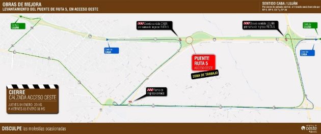 La comunicación enviada por Autopistas del Oeste, empresa concesionaria vial del Acceso Oeste informa que, en el marco de la obra Ampliación Puente R.N.N° 5 y nueva Rama de Vinculación, se realizará el levantamiento del puente de vinculación de esta ruta y la R.N.N°7. El tránsito será desviado, en ambos sentidos de circulación, la noche del jueves 04 de enero y la madrugada del viernes 5 de enero.