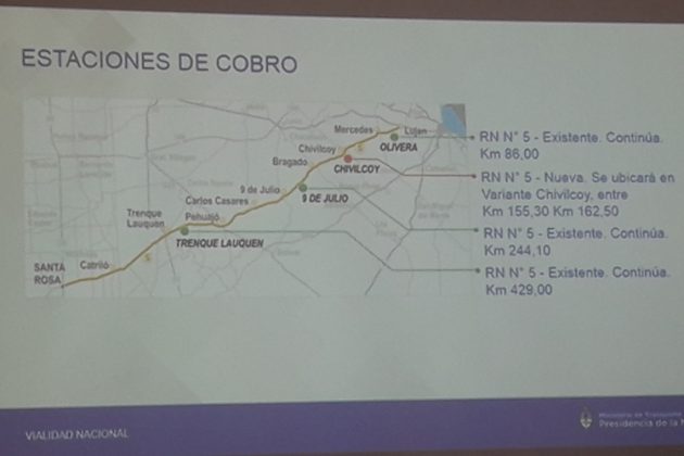 «La Audiencia fue muy explicativa, presentada en Power Point, casi no dejando lugar a dudas o consultas por los participantes», contó Carlos Mosso a su regreso. «Es difícil resumir tres horas de audiencia, pero podemos resaltar que las obras contarán con tres variantes en Suipacha, Chivilcoy y Alberti; y una cabina de peaje más en la variante de Chivilcoy, que podrá ser evitado utilizando la traza vieja o existente en la actualidad. La obra completa se estima en 900 millones de dólares que incluye autopista Lujan-Bragado, ruta segura Bragado-Anguil, autopista Anguil-Santa Rosa, cruces a desnivel, colectoras, iluminación de cruces, por ejemplo», agregó Mosso de acuerdo a la información brindada en la audiencia pública.