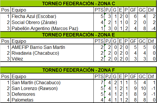En Escobar, Pabellón de Marcos Paz perdió 4 a 2 con Flecha Azul y quedó muy relegado en la tabla, pensando en la clasificación. Sólo sumó un punto en el empate en la primera fecha y luego perdió los dos partidos restantes por dos goles de diferencia. Ahora se encuentra último y deberá vencer a Social Obrero de Zárate por una diferencia de tres goles y luego esperar a que los de Escobar ganen en la última jornada. Complicada situación para el cuadro azul y blanco.