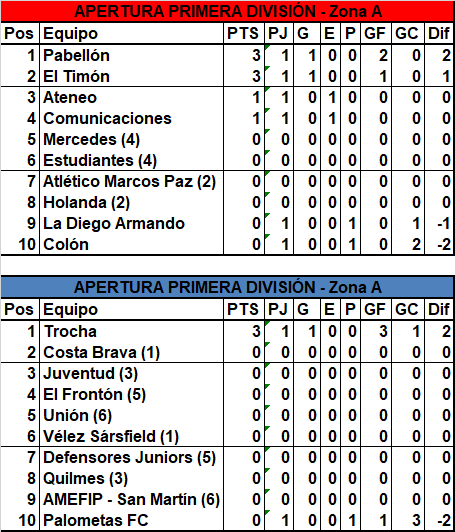 Abrió la jornada el empate en cero entre Comunicaciones y Ateneo en el primer duelo de la Zona A, mientras que, a Continuación, El Timón comenzó con el pie derecho al vencer al debutante Peña La Diego Armando por 1 a 0 con gol de Juan Lagrecca. Tres jugadores vieron la roja en este encuentro. Dos de ellos en el equipo de Jáuregui, Krenz y Acensos y otro en el Xeneize, López.