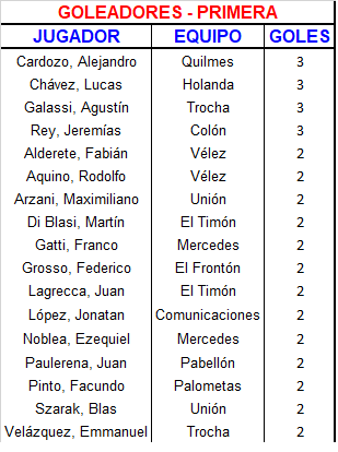 | Colón | 5 | Jeremías Rey (3), Damián González, Lucas Castro |